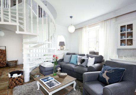 Die offene Bauweise mit zentral gelegener Wendeltreppe verbindet die einzelnen Räume. Die verwinkelten Bereiche bieten individuelle Rückzugsmöglichkeiten in romantischem Ambiente.